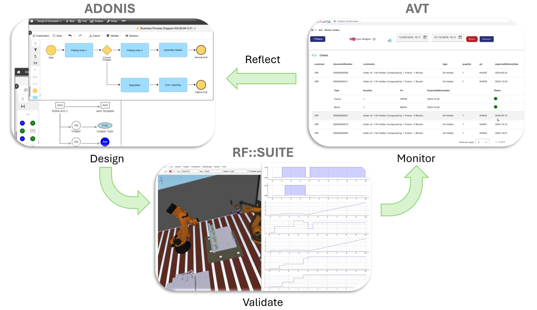Gartner's 2025 Voice of the Customer report , to integrate AAS and elaborates the usage of BPMN in combination with AAS to manage the digital twins of a production line, in the context of MODAPTO. ADONIS is a fully web-based business process management suite that is capable to extend the BPMN representation with production-relevant methods and artifacts. ADONIS has been extended with digital twin concepts to offer a management suite that provides quality-assured versioning, release and approval of AAS-compliant digital twins within the context of a production process represented in BPMN.
